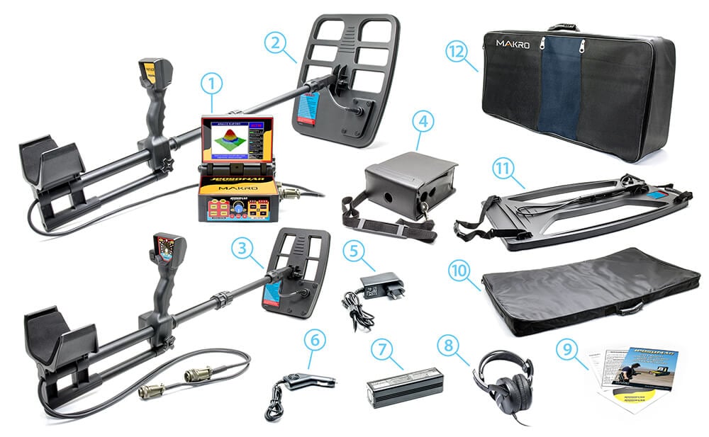 1 - Jeosonar 3D Sistem Kutusu 2 - T44 Arama Başlığı ve Arama Kolu 3 - T21 Arama Başlığı ve Arama Kolu 4 - Sistem Kutusu Deri Taşıma Çantası 5 - Şarj Cihazı 6 - Araç Şarjı 7 - Lityum Polimer Batarya 8 - Kulaklık 9 - Kullanım Kılavuzu ve DVD 10 - T100 Arama Başlığı Taşıma Çantası 11 - 100x60 Cm DD Arama Başlığı (T100) 12 - Jeosonar 3D Taşıma Çantası
