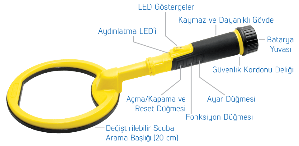* PulseDive Scuba Dedektörü'nün siyah ve sarı olmak üzere 2 renk versiyonu mevcuttur. Resimde gösterilen sarı versiyonudur.