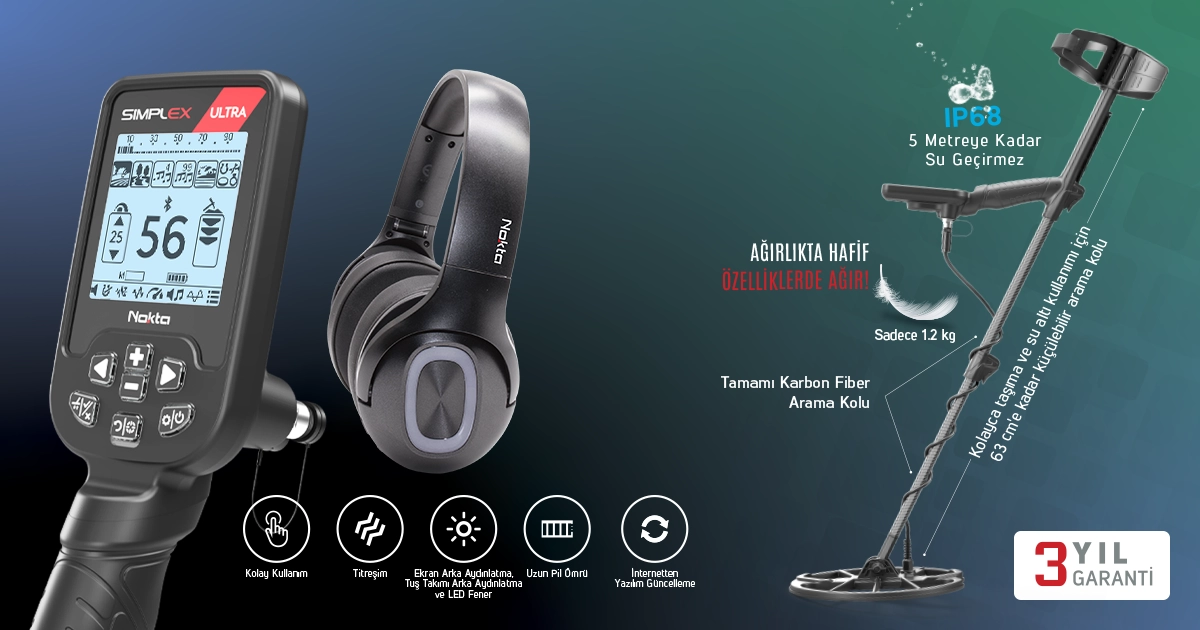 Nokta'nın SIMPLEX Yeni Nesil serisi göz alıcı bir estetik, gelişmiş teknik performans, 5 m'ye kadar tamamen su geçirmezlik ve 1,2 kg'lık etkileyici bir hafiflik sunar. SIMPLEX farklı fiyat seviyelerinde üç farklı model sunarak, kaliteli dedektör kullanımını mümkün ve makul fiyata satın alınabilir kılmaya devam ederek rakipsizliğini koruyor. İster dedektör kullanmaya yeni başlayan biri olun, isterseniz de uygun fiyatlı fakat güçlü bir dedektör isteyen bir kullanıcı, SIMPLEX Yeni Nesil seride size uygun bir dedektör mutlaka bulacaksınız! Simplex birçok yönden gelişti: Donanım, yazılım, tasarım ve ergonomi... Ancak bir şey değişmedi: Müşterilerini önemseyen bir firmanın arkasında olduğu, dünya çapında kanıtlanmış performansı ve başarısı! Her yönden toz girişine karşı korumalı ve 5 metreye kadar su geçirmez. Arazi, Park, 4 Ton, 99 Ton, Plaj, Tüm Metaller SIMPLEX'in tek ekranda kolay kullanım özelliği sayesinde, cihazınızı açarak hemen kullanmaya başlayabilirsiniz. İstenmeyen metallerin Hedef ID'lerini kapatır. Frekansı küçük adımlarla kaydırarak elektromanyetik parazitten kolayca kurtulun. SIMPLEX bir hedef bulduğunda titreşim ile uyarır! Hem su altı kullanım için hem de işitme engelli kullanıcılar için ideal.